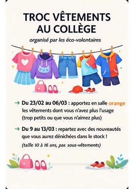 Par THOMAS BRACK, publié le vendredi 27 février 2026 17:59 - Mis à jour le samedi 28 février 2026 09:06Dans le cadre de leur réflexion sur la surconsommation, les éco-volontaires organisent dans le collège un Troc Vêtements à l'intention des élèves. Le but est de sensibiliser leurs camarades au fonctionnement de la Fast Fashion et à ses conséquences. -